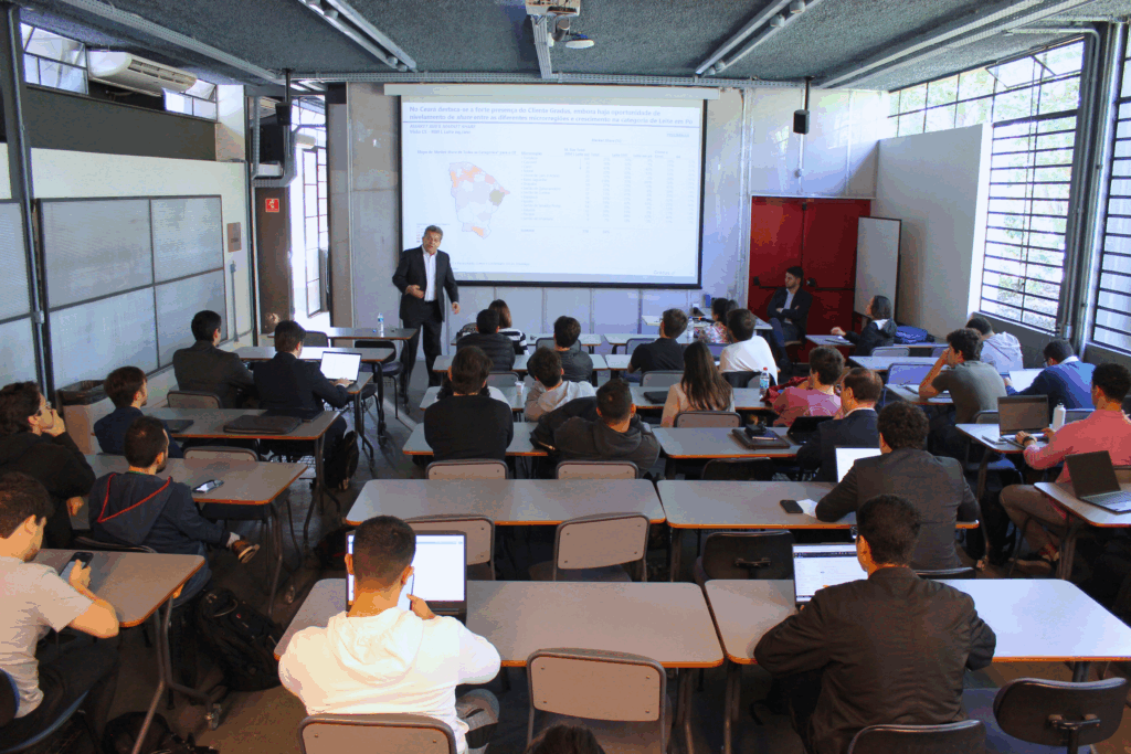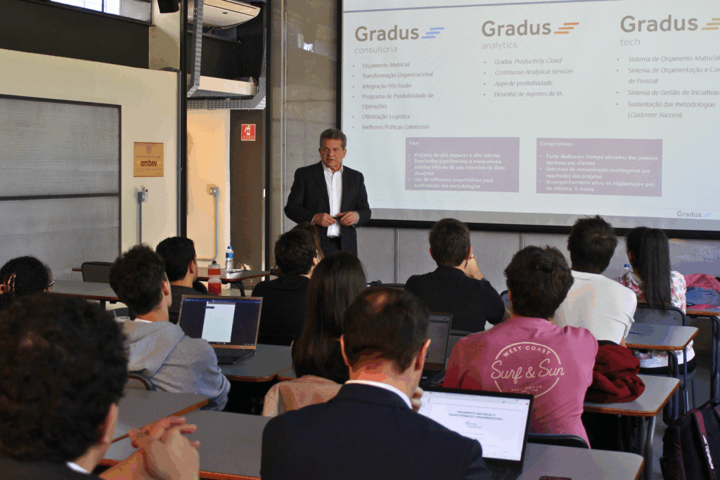 Gustavo Pierini, presidente e fundador da Gradus Consultoria, compartilhou com os alunos e presentes sua profunda experiência na transformação de grandes organizações. Com uma trajetória que inclui a participação na fusão que deu origem à Ambev e, posteriormente, à formação da AB InBev, Pierini discutiu casos práticos e metodologias para a execução eficaz da estratégia.
